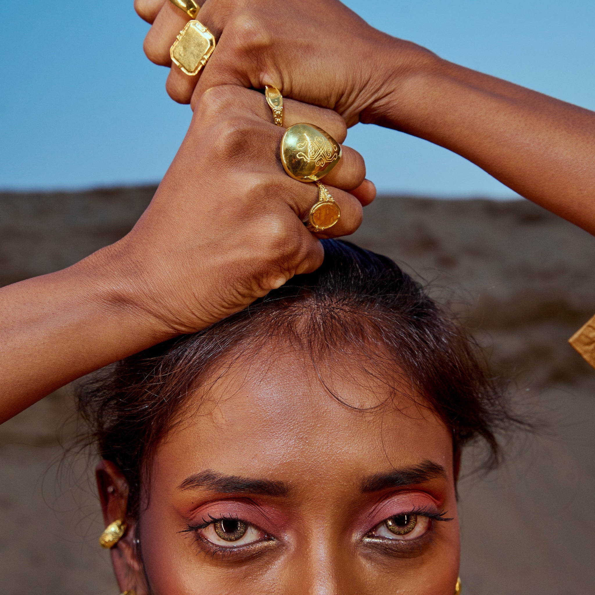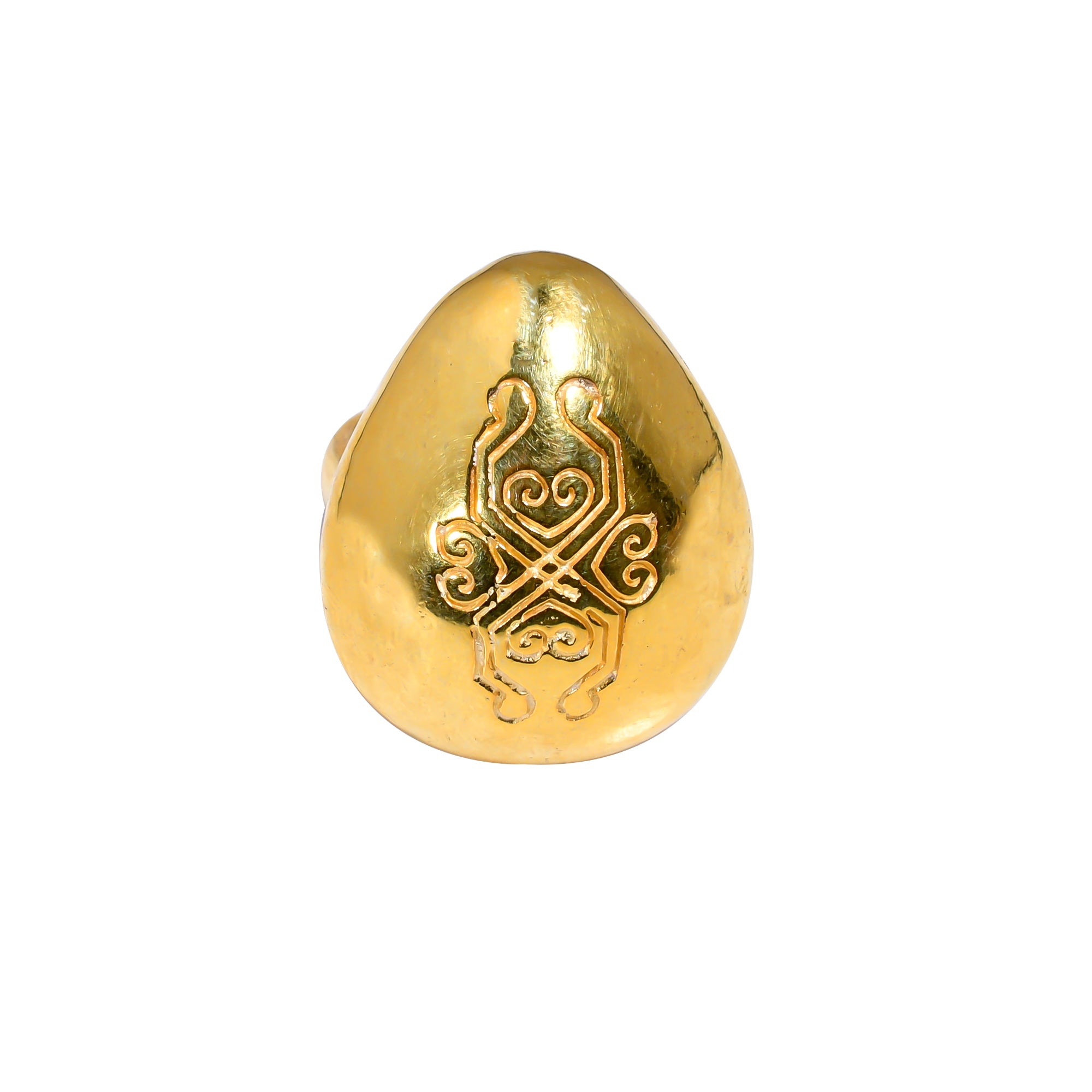 The Odyssey Ring crafted in sterling silver, features a teardrop-shaped dome with intricate engravings. Its smooth, polished surface enhances the metal's shine, while the etched design adds depth.