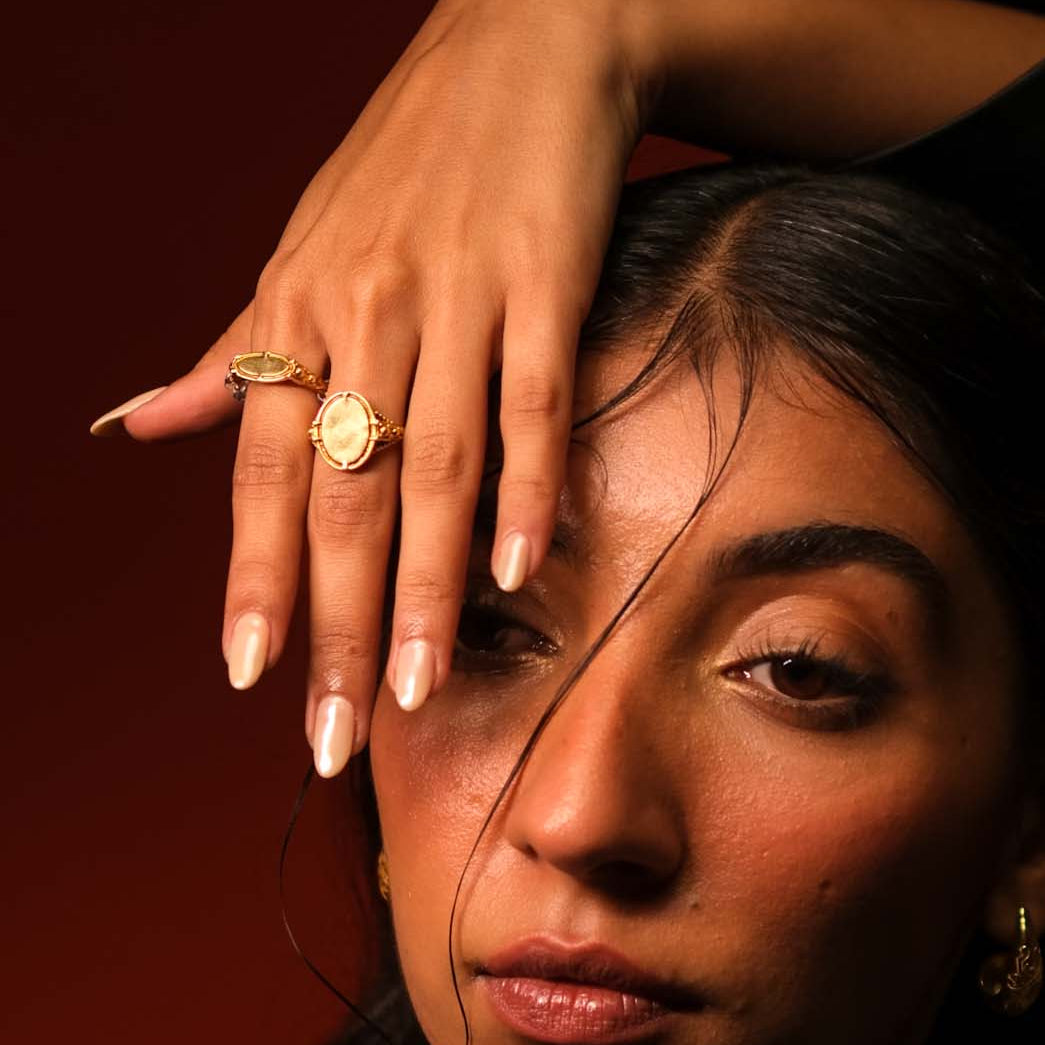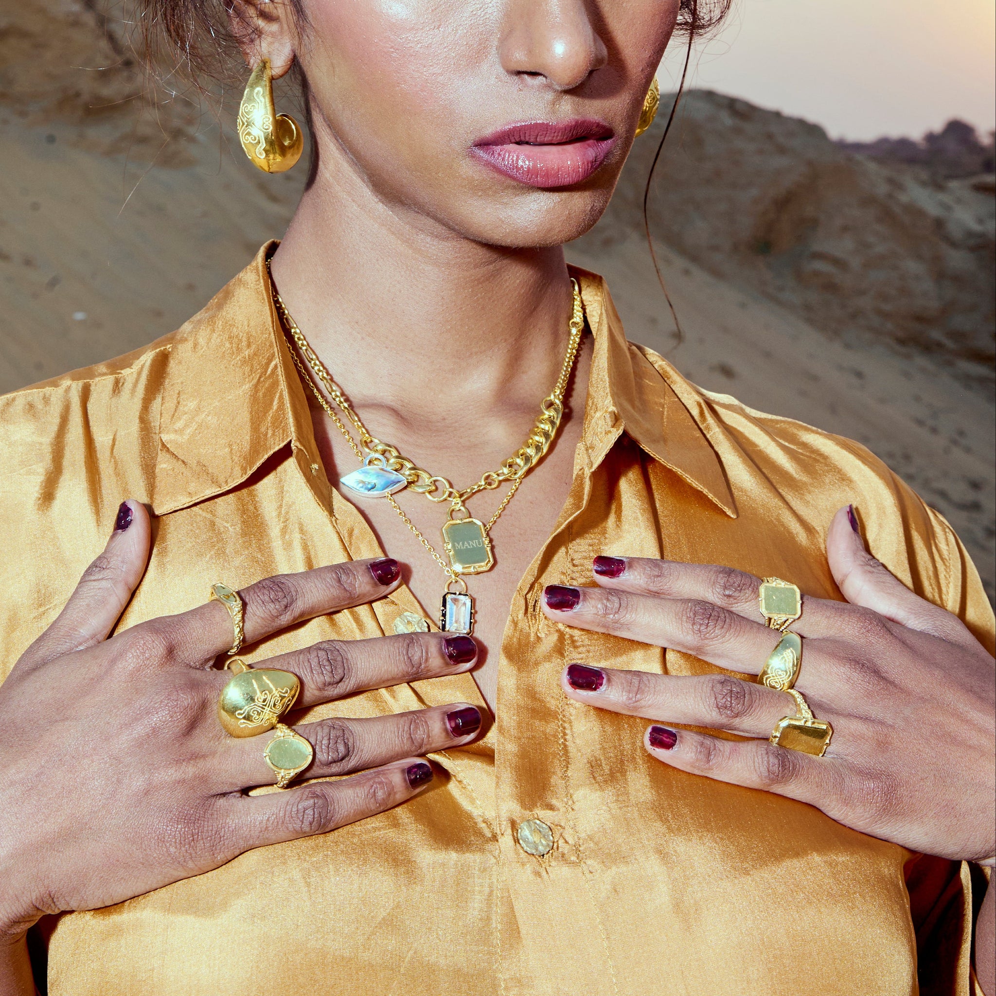 This oval signet ring features a high polished surface, serving as a blank slate for engraving—a canvas to make your own. Bordered by subtle geometric edges, the design balances texture and symmetry with structural ridges on the band. Minimal, bold and timeless, it’s yours to personalize.