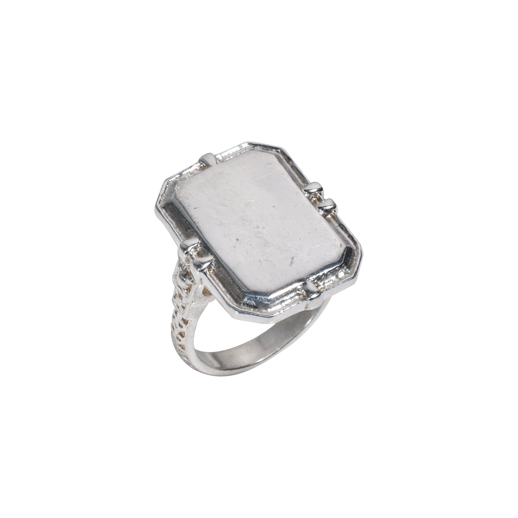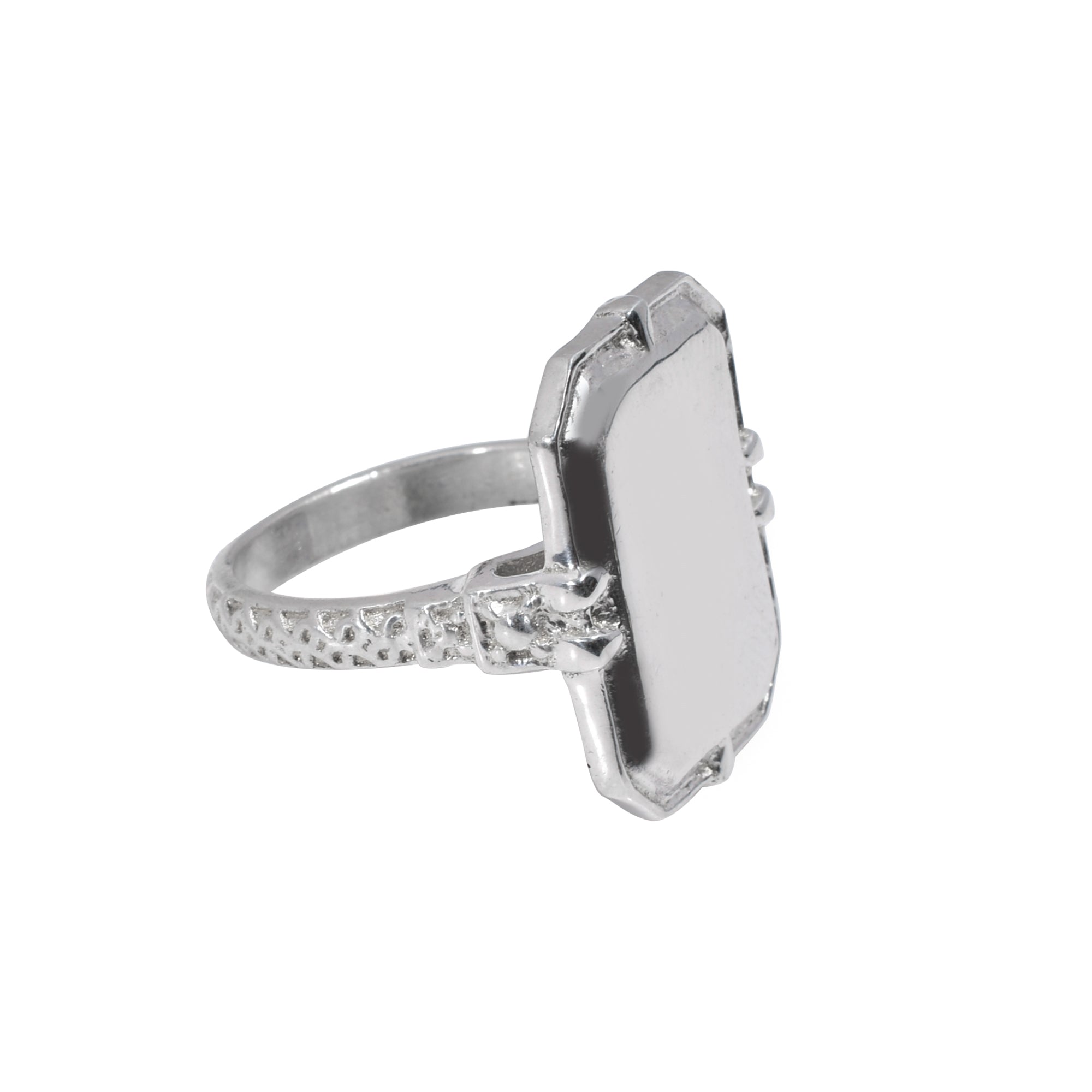 This rectangular signet ring features a polished Silver-tone face, serving as a blank slate for engraving - a canvas to make your own. Bordered by subtle geometric edges, the design balances texture and symmetry with structural ridges on the band. Minimal, bold, and timeless, it’s yours to personalize.